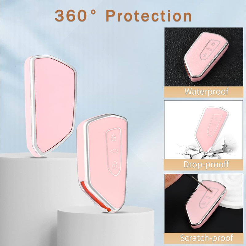 OFF WE GO Car Key Case with Key Fob Key Cover for VW Golf 8 Seat Leon MK4 Tarraco Ateca Skoda Octavia 2020 Cupra 3 Buttons TPU Car Key Case Key Case, Pink silver