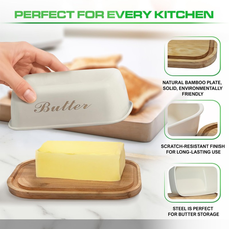- Premium Quality: This butter dish for refrigerator provides durability. The lid of the butter tub made from galvanized steel, it's the smooth finish resists scratches. Natural bamboo butter tray, is eco-friendly and resistant to odors and stains, keep your butter fresh and flavorful.