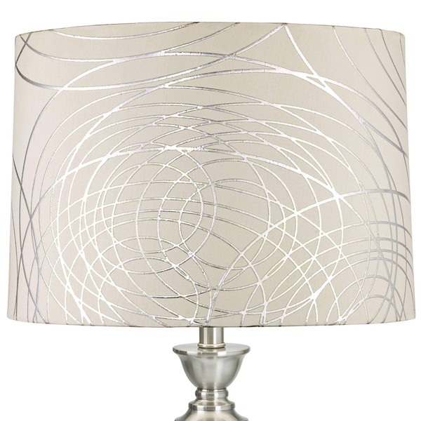 - Off-white pattern with silver graphic lines; hardback shade, polyester fabric.