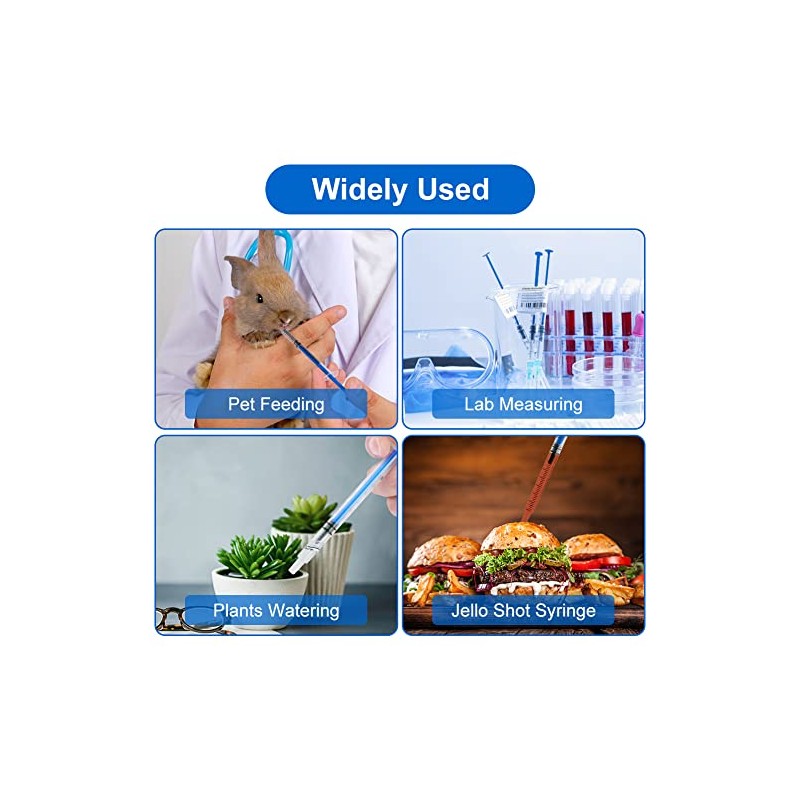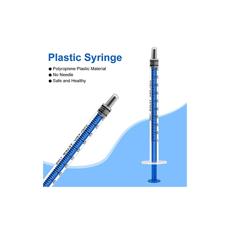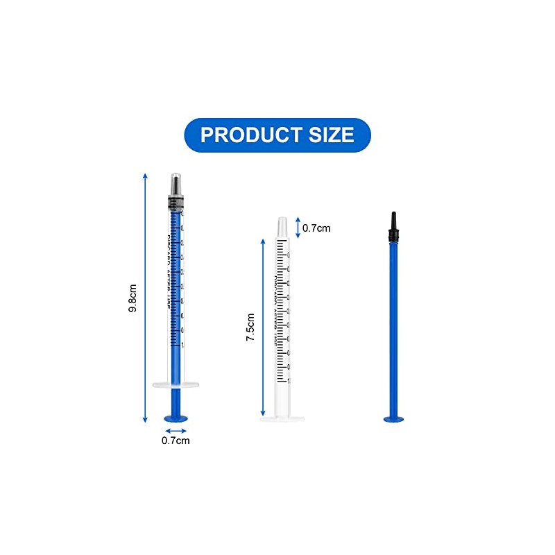 - 1ml SyringeThe small plastic syringe has a capacity of 1ml. Milliliters are precisely graduated and printed. The clear plastic bottle makes it easier for you to observe the amount of liquid, so that it can absorb and transfer the liquid accurately.