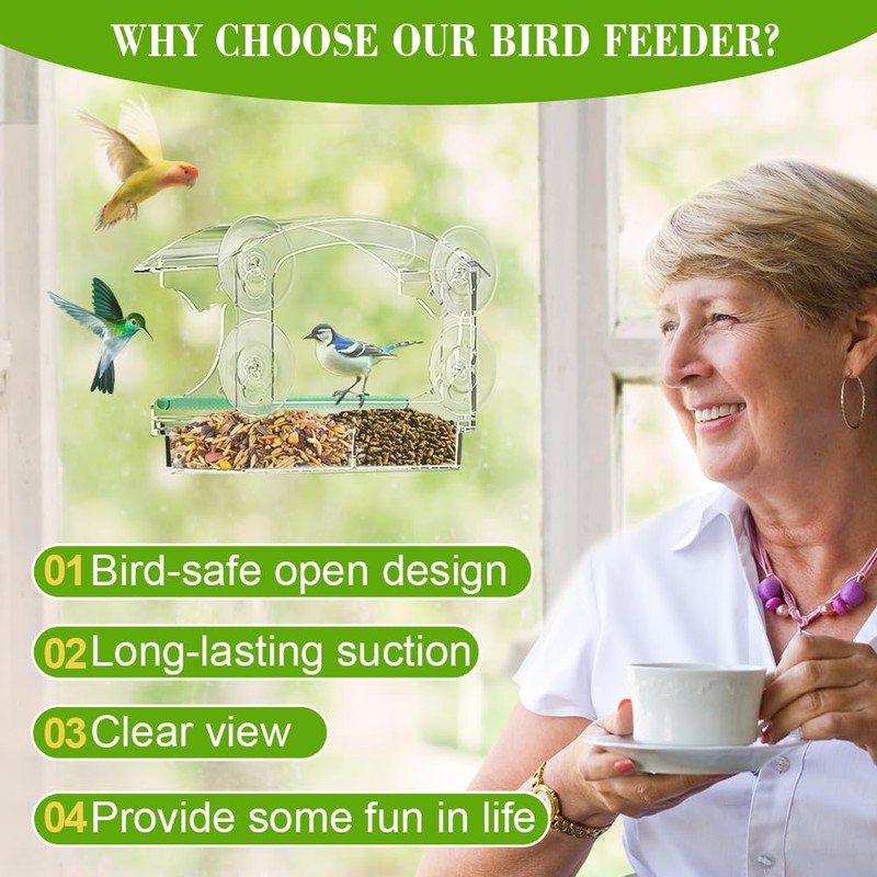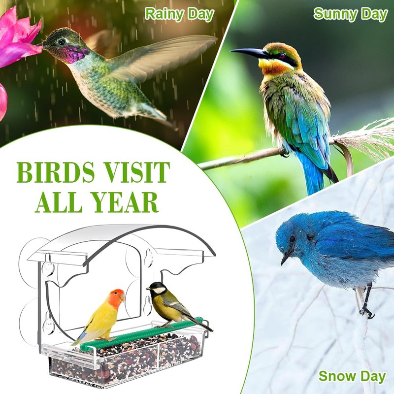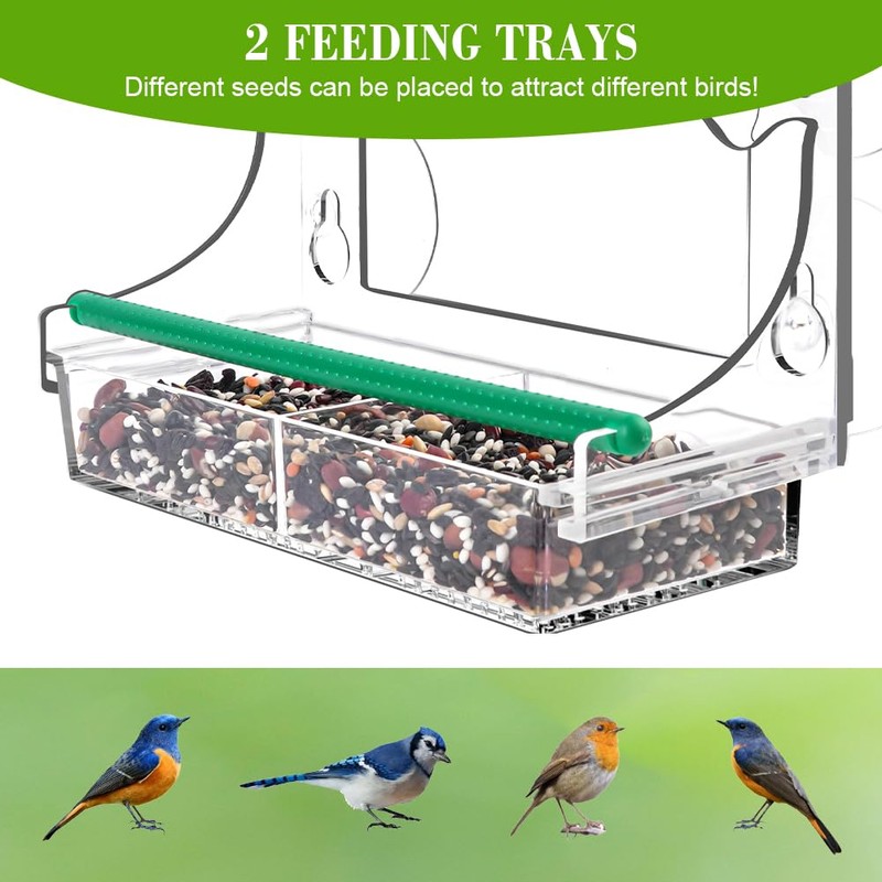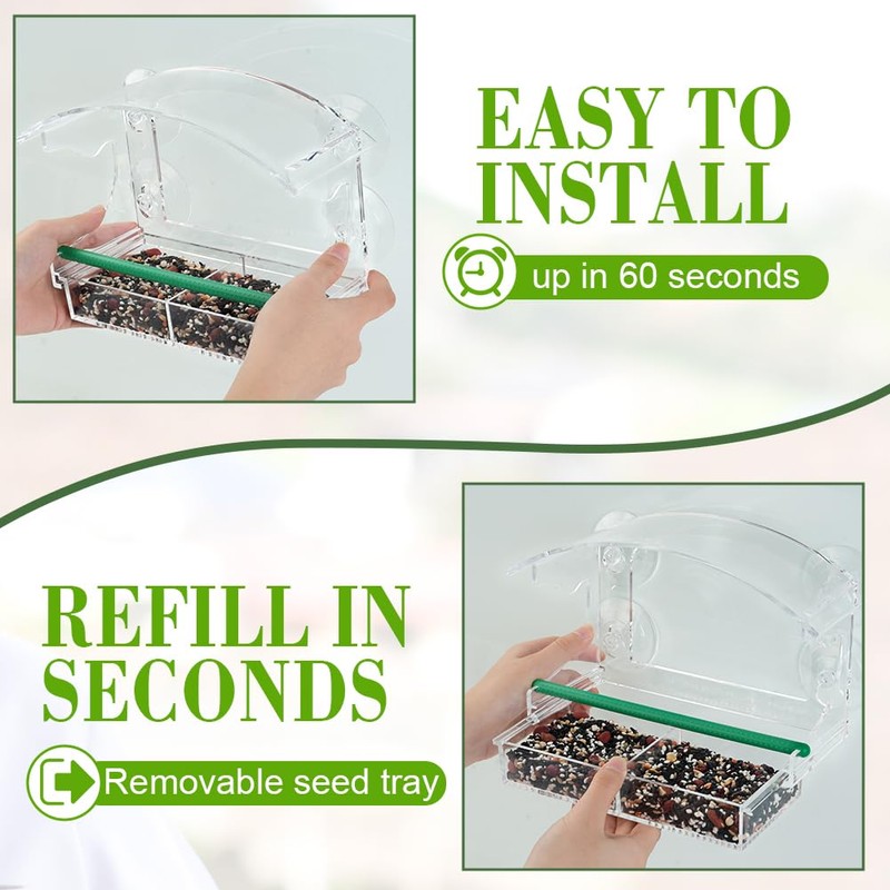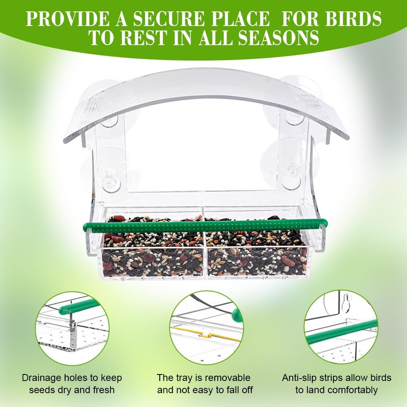 - Clear view: The clear acrylic bird feeder with 4 strong suction cups and a removable tray can be easily attached to your window for a clear view, so you can watch birds in the house up close. It brings nature right to your window.