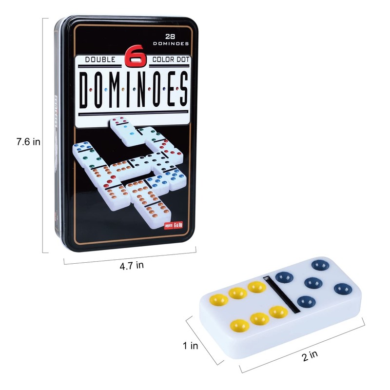 Offelec Double Six Dominoes, 28 Tile Colored Dots Domino Game Set with Tin Box, Classic Family Board Games for Kids, Adults and Families for 2-4 Players