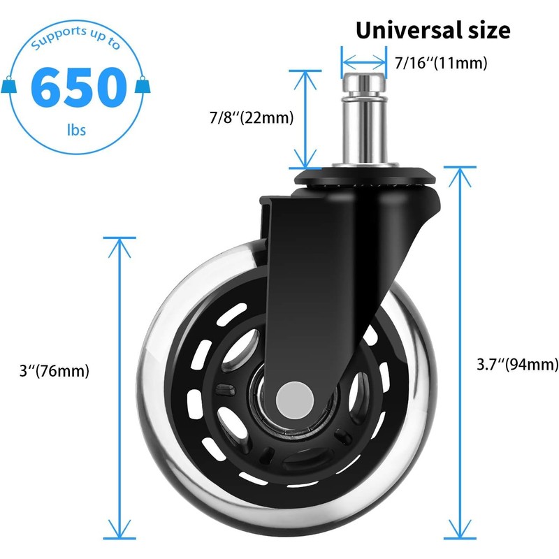 - ⭐PROTECT YOUR FLOORS:Office chair wheels for wood floors,unlike traditional plastic casters, these high-quality soft polyurethane casters can roll on any type of floor includes hardwood and carpet without any scratches. Universal size stem of 7/16" (11mm) x 7/8" (22mm) that will fit most chairs (IMPORTANT: NOT compatible with IKEA chairs).