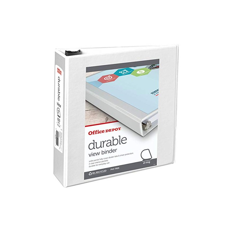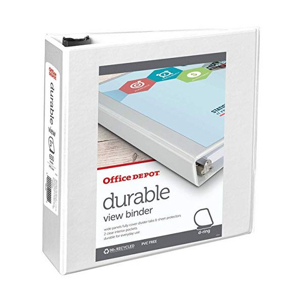 Office Depot Brand Durable View D-Ring Binder, 3" Rings, 39% Recycled, White