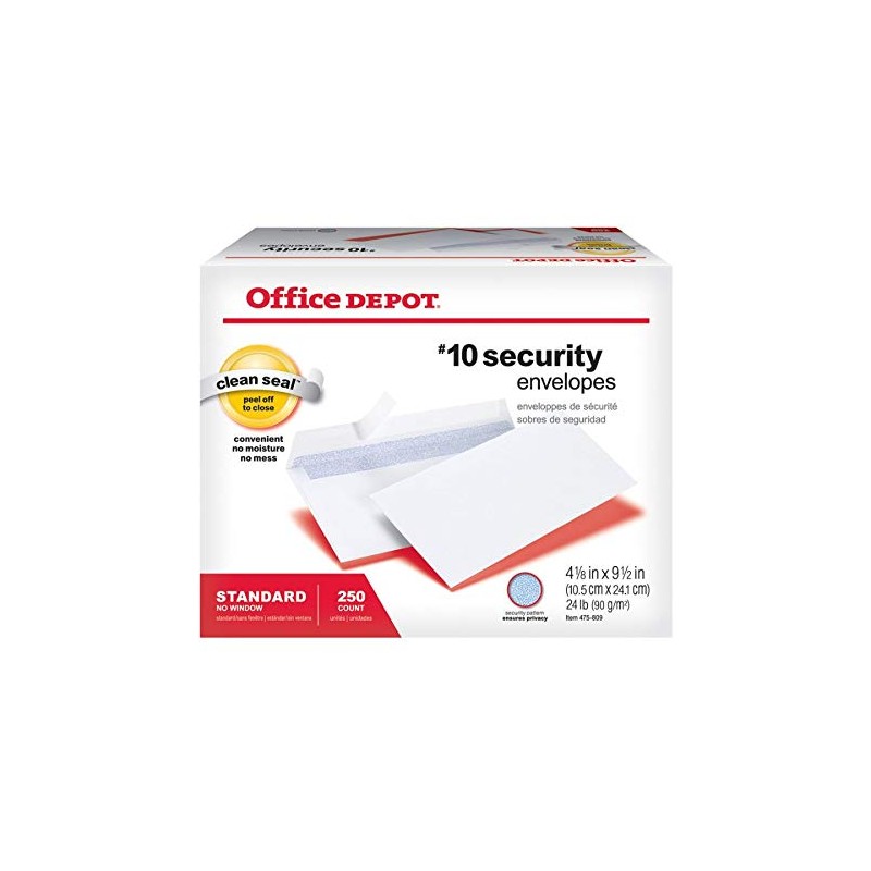 Office Depot Clean Seal(TM) Security Envelopes, #10 (4 1/8in. x 9 1/2in.), White, Box Of 250, 77148
