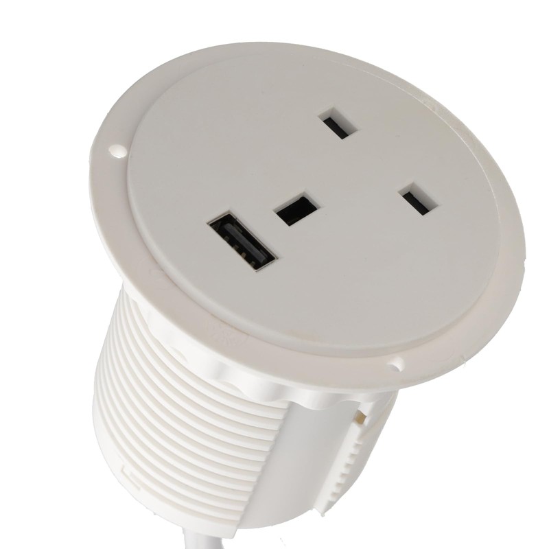 Office Desk Mount 60mm Grommet with UK Mains Power and USB-A Fast Charge White