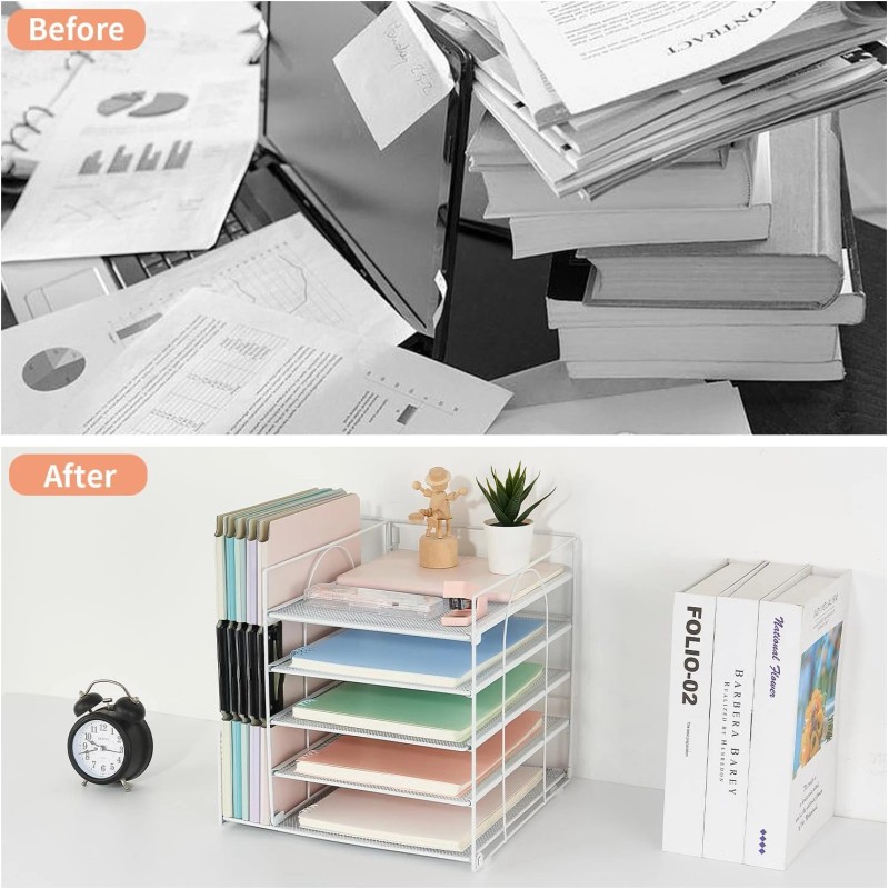 - ✅ EASY TO ASSEMBLEL: 5 Trays and 1 File Holder. PET anti-slip feet to prevent it from sliding or scratching surfaces. Using a tidy desktop organizer can better improve work efficiency. Great to organize your documents, magazines, letters, files, folders, mail and much more.
