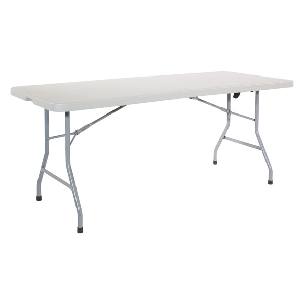 - 6 foot folding table features a heavy-duty blow-mold light grey resin top for durability and easy cleanup