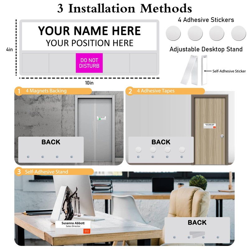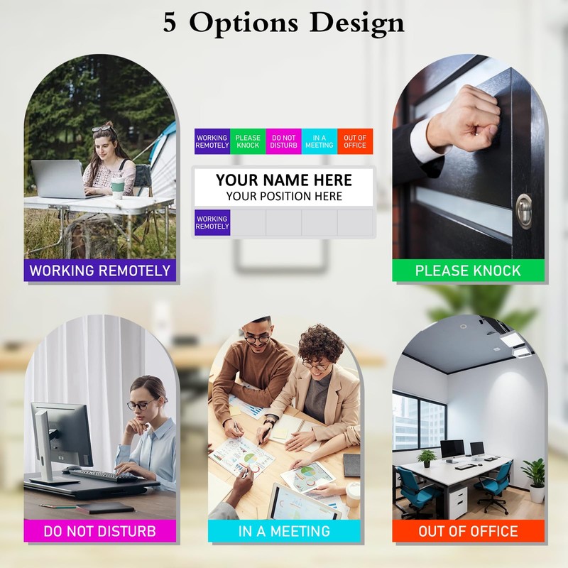 - Nameplate status sign: This sign has 5 different room statuses, which are clear and easy to distinguish. Insert the printed name into the custom text area, and nameplate can be reused. Clear identification helps employees or visitors easily grasp room or job information, improving office efficiency.