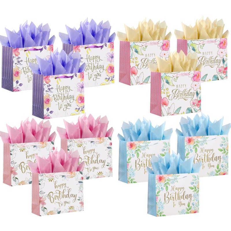 - 🎈Special Design: Each bag features a stylish design with elegant "Happy Birthday" lettering in the center, surrounded by beautiful flowers. Gift bags and tissue paper are included. This set offers everything you need in one convenient package, saving you time and money.