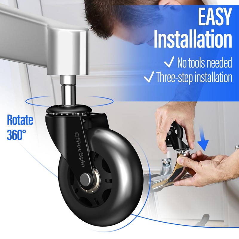 - HIGH QUALITY - Our OfficeSpin office chair casters are made of industrial-grade steel and high-quality polyurethane, which can make a world of difference in the performance and longevity of the casters. Built-in rollers enable smooth and quick movement in multiple directions, effectively minimizing vibrations caused by frequent movement