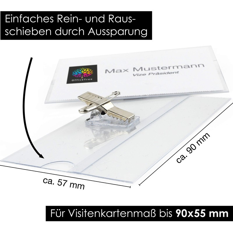 - Transparent high-quality plastic holder for business card dimensions of up to 90 x 55 mm, individually packaged, with safety pin and additional clip.