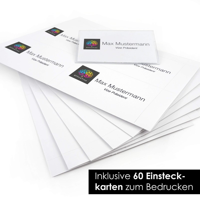 - Complete set - set of 50 name badges with combination clip, incl. 6 perforated A4 print sheets with 10 inserts each.