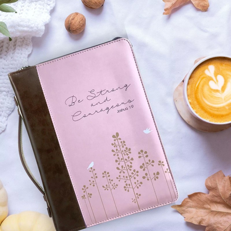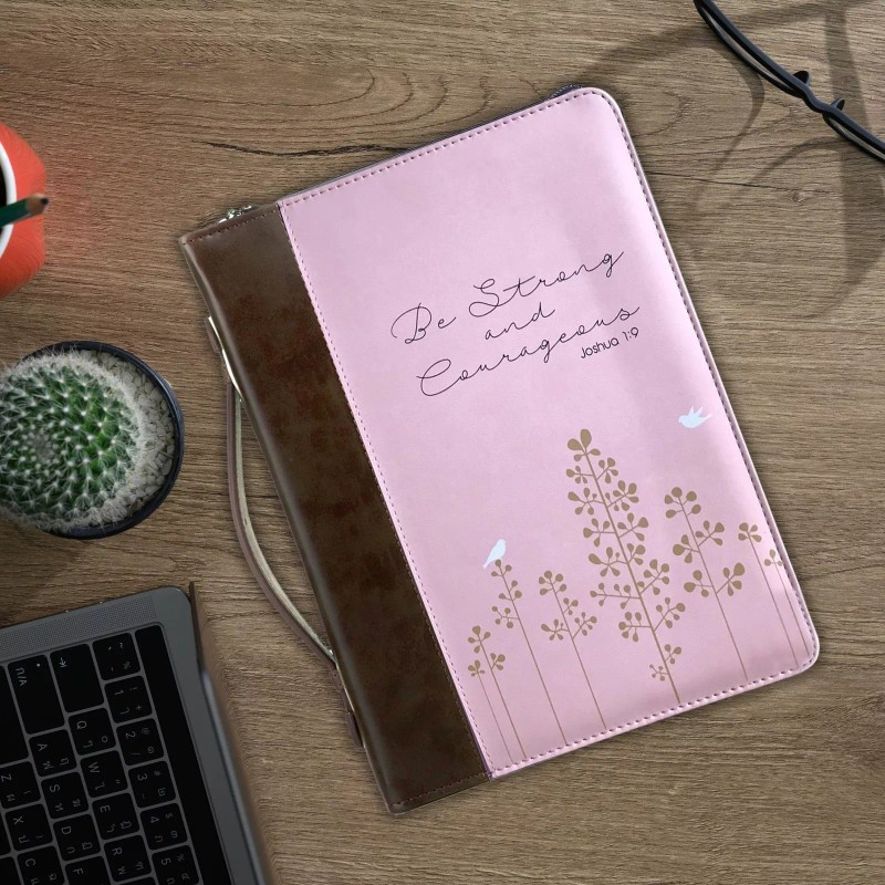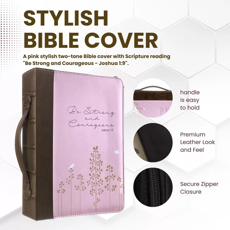 - Stylish chocolate/brown two-tone Bible cover with Scripture reading "Be Strong and Courageous- Joshua 1:9" on the front cover and features a cross zipper-pull, a convenient lay-flat spine handle, and 2 pen loops inside