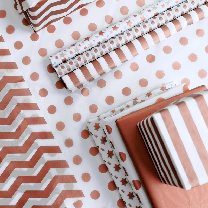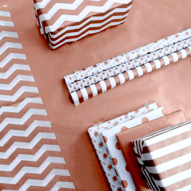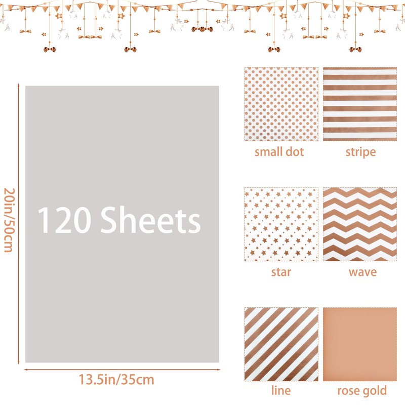 - 6-Style: The bright rose gold gift wrapping tissue paper features 6 vibrant designs (20 sheets of each color, 120 sheets in all), including star, waves, small dots, stripes, lines and solid rose.