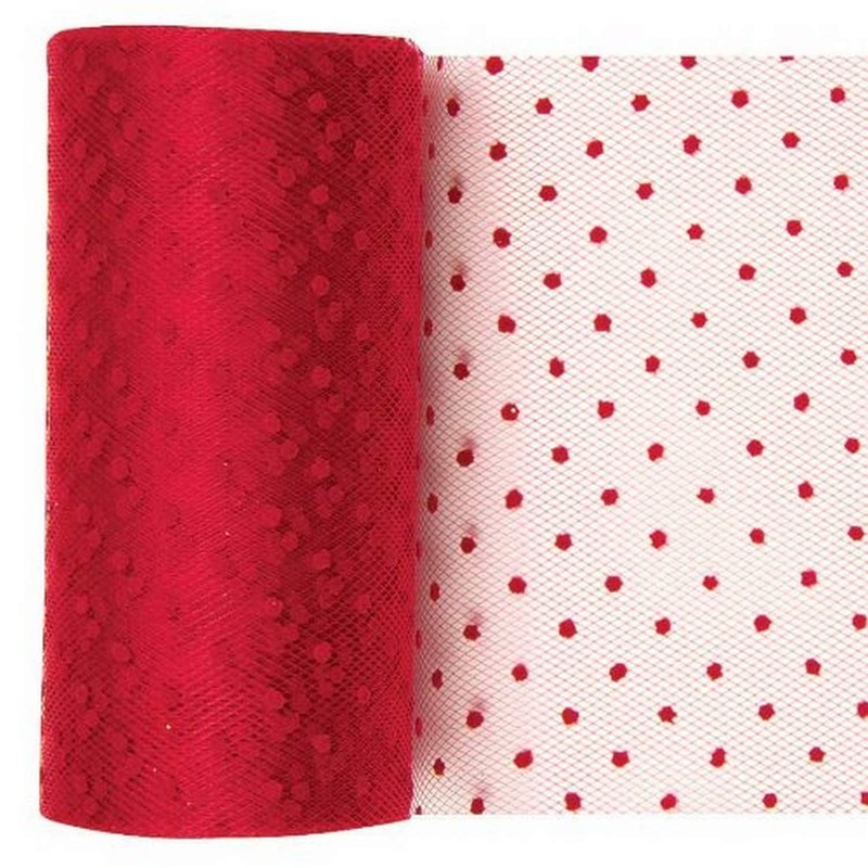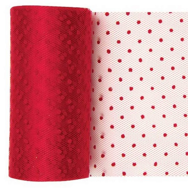 - Tulle fabric measures 6'' wide and is designed with a red polka dot pattern.