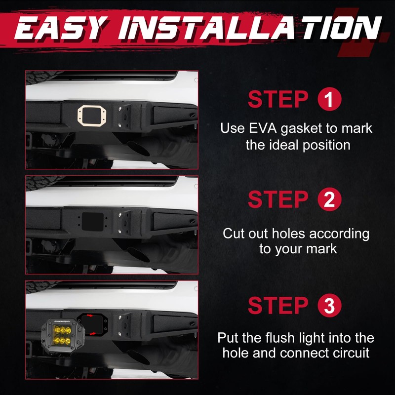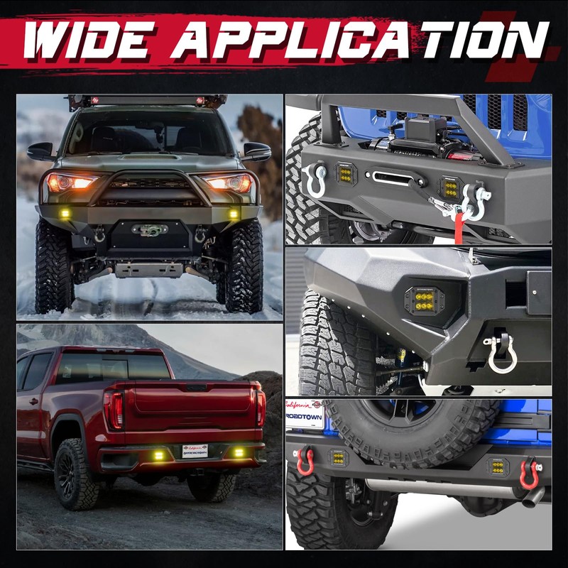 - WIDE APPLICATION - Universal fit for all 9-30v vehicles and other applications, the yellow flush LED light pods can be compatible with SUV, UTV, ATV, truck, tent, chevy, honda, etc. Come with shockproof EVA gaskets for easy mounting on bumper, or any location you want. The recessed installation and black panel offer a sleek, factory-upgraded look.