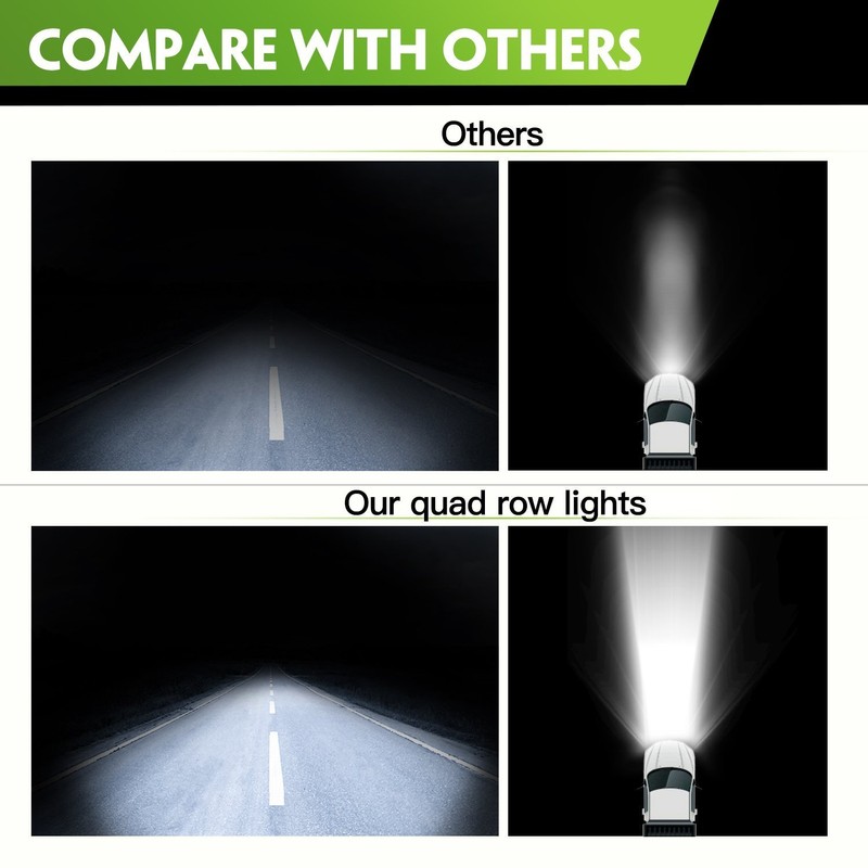 - INCREDIBLE BRIGHTNESS - Command the dark night with the most powerful QUAD row light bar series in the market. With a staggering 480 Watts and 48,000 Lumens , the 30'' LED light bar turns night into day while consuming very little power. Additional two row leds with combo beam pattern ensure more lights forward to cover a wide area and long distance.
