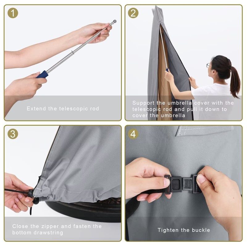 • Zipper and Telescopic Rod easy to open and close install the umbrella cover without a ladder.