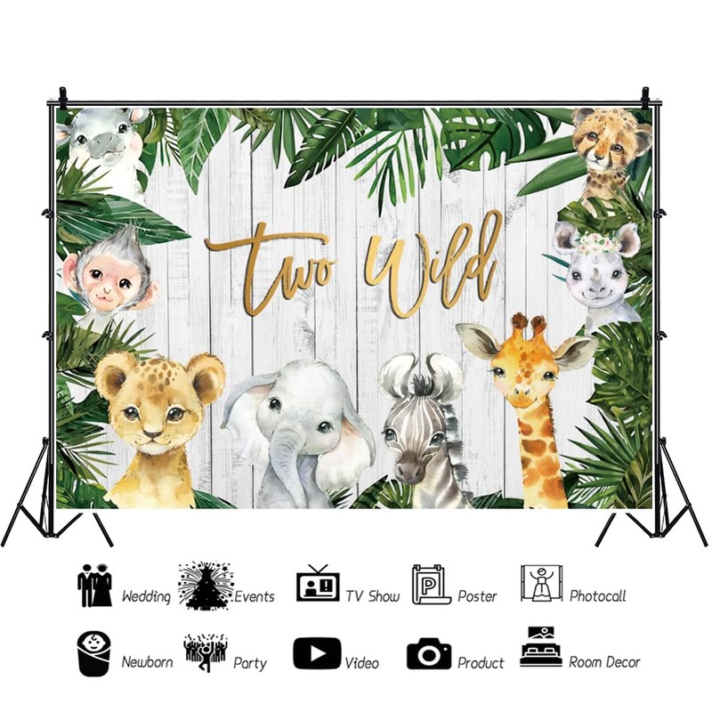 OFILA 8x6ft Two Wild Theme Birthday Party Backdrop Rustic Wooden Jungle Safari Animals Green Forest Palm Tree Leaves Background Kids Boys 2nd Birthday Party Dessert Table Decoration Banner Supplies