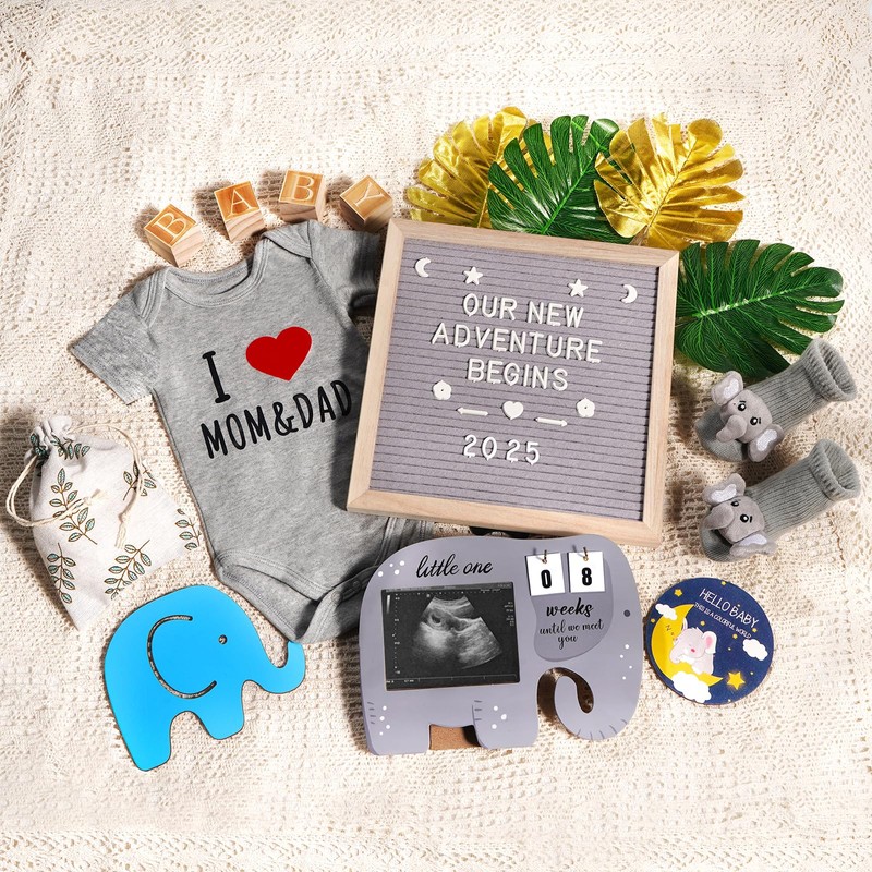 - 12 Pcs PregnaSURPRISE MOM-TO-BE WITH BABY ANNOUNCEMENT IDEAS - This Pregnancy Reveal set it includes 1* felt letter board, 1* cozy baby bodysuit, 1* delicate sonogram picture frame, 1* elephant socks, 1* cute baby sign, 1* elephant wood sign 4* handmade baby wood blocks , 4* monstera leaf. It will serve as the perfect keepsake to record the future moments full of memoriesncy Announcement Set