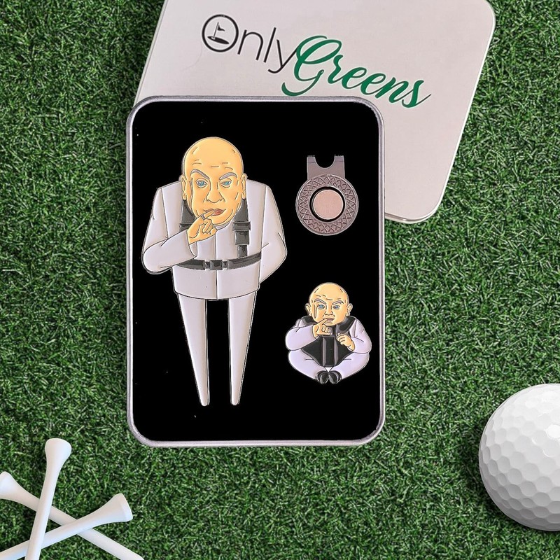 Step onto the green with a touch of classic comedy with this unique Dr. Evil & Clone Caddy Divot Tool and Ball Marker Set. Perfect for golf enthusiasts and film buffs, this set is a must-have addition to your golfing gear.