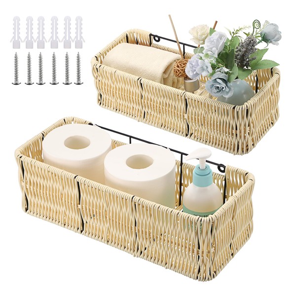 OGA Pack of 2 Shower Baskets for Hanging Rattan Plastic Storage Basket Beige Shower Shelves Waterproof Shower Wall Basket Bathroom Organiser Bathroom Shelf for Towel Shampoo Conditioner (Large +