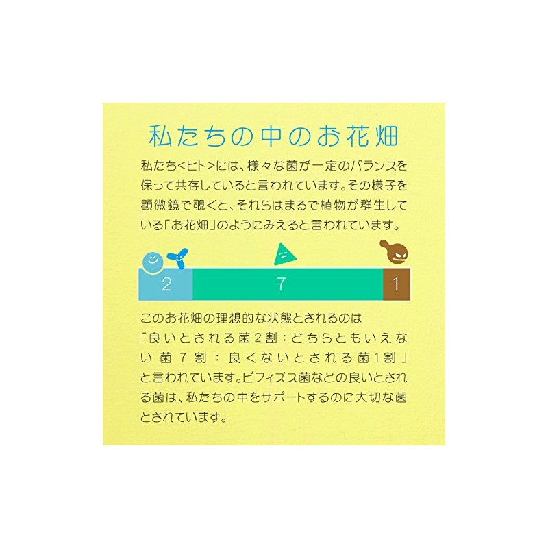 - 【ビフィズス菌の働き】善玉菌として有名なビフィズス菌は、糖を分解して酢酸を作り出すという特徴があり、環境を整え健康や生活リズムを健やかにサポートするといわれています。