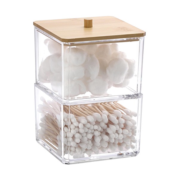 OGANAZI 2 Stück Acryl Wattepads Box Stapelbar Wattestäbchen Behälter Klein Schminktisch Organizer Klar Aufbewahrungsbox mit Bambusdeckel für Beauty-Ei, Kosmetik, Schreibwaren, Haarbänder (Quadrat)