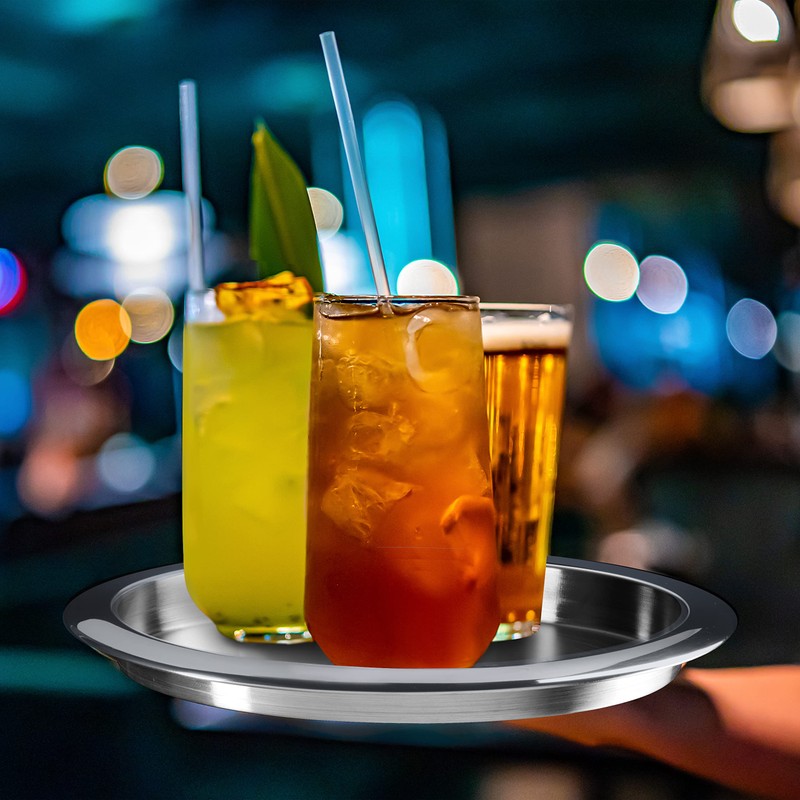 Made of durable stainless steel, this sleek serving tray is a nice addition to any home bar, commercial bar, or kitchen. Deep lip keeps food, dishes, or accessories on tray with a 14" diameter. Item is also lightweight for easy carrying.
