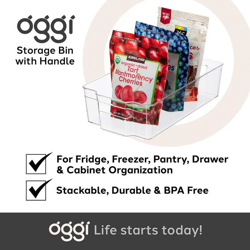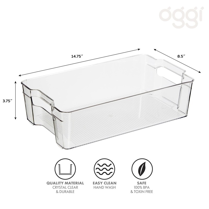 Oggi Stackable Storage Bin With Handle - Large (14.75" x 8.5" x 3.75") - Ideal for Kitchen Organization, Pantry Storage, Fridge Organizing, Clear