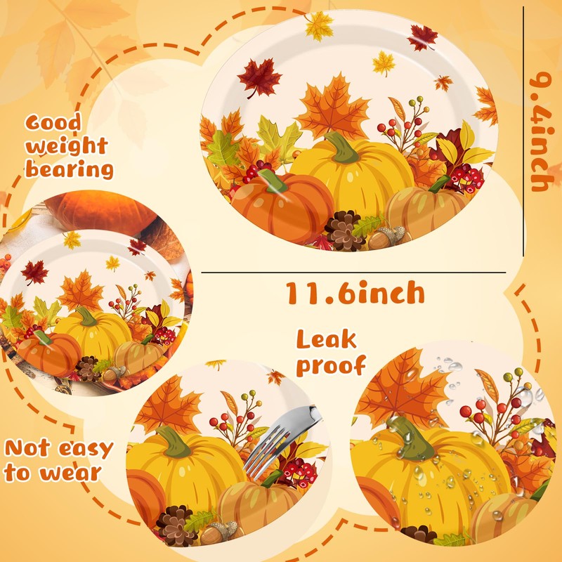 • package contain: you will receive 100pcs fall themed party tableware set includes 50pcs fall paper plates,which are design with pumkins,50pcs fall party maple leaf napkins , each set can serve 50 guests. sufficient in quantity and diverse in styles to meet your decorating and replacement needs. fall themed decorations plates and napkins is a very nice choice of thanksgiving and fall party decorations and will add happy atmosphere to any event you may have