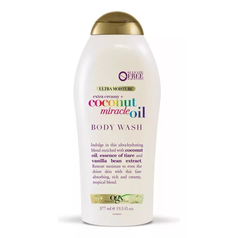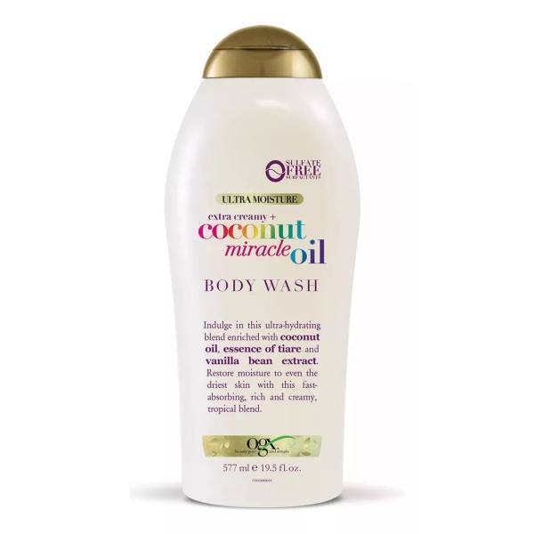 El jabón corporal OGX Extra Creamy + Coconut Miracle Oil Body Wash, tiene una fórmula elaborada con aceite de coco, aceite de vainilla y extracto de flor de tiaré que ayudan a hidratar y suavizar la piel.