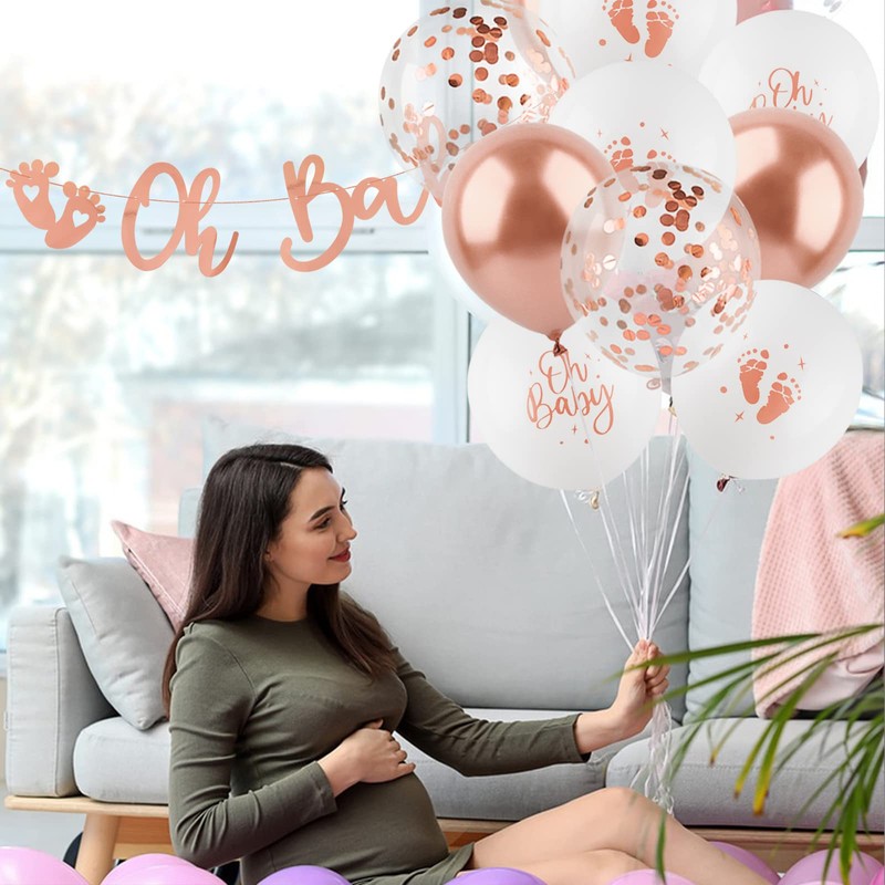 Oh Baby Garland Rose Gold Baby Shower Decoration Banner Paper and 12 Pieces Latex Balloons (12 Inches) Hanging Decoration for Baby Shower Baby Shower Gender Reveal Party Christening etc.