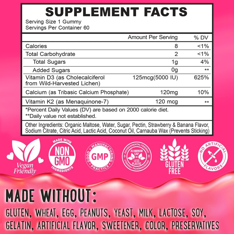 - Includes 3 bottles (60 gummies each) for a total of 180 D3K2 gummies in three delicious flavors.
