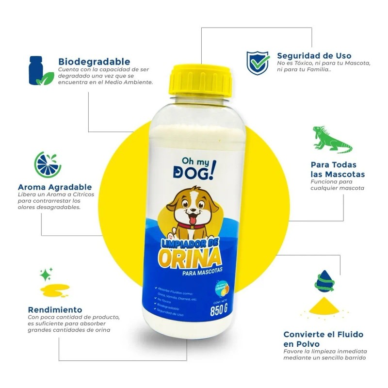Oh My Dog Paq. 2go (850 g + 250 g) elimina manchas y olores de orina, ideal para mantener tu hogar fresco y limpio. Fácil y seguro. ✨🐶