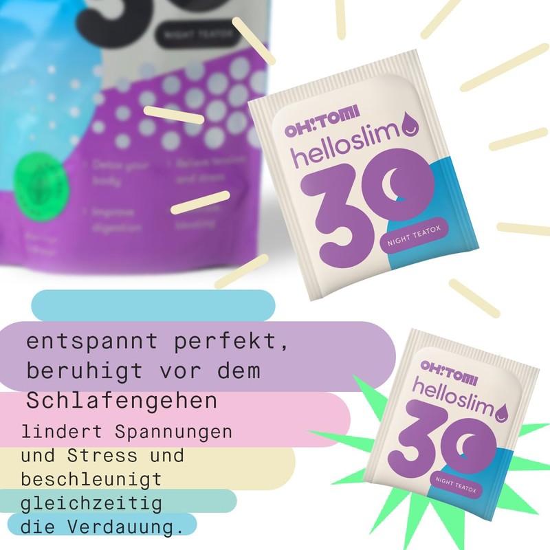 Oh!Tomi | Entgiftungstee Hello Slim | Für die Nacht | Detox | Fördert Abnehmen | Entspannend | Hilft Einschlafen | Natürliche Inhaltsstoffe | Zarter Geschmack | Einfach zuzubereiten | 30 Beutel