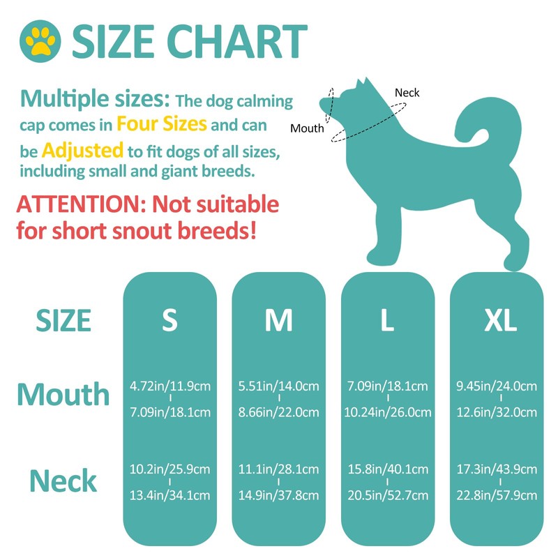 - Multiple sizes: The dog calming cap eye mask comes in four sizes and can be adjusted to fit dogs of all sizes, including small and giant breeds. Attention: Not suitable for short snout breeds as: Shih tzu, French bulldog, Pug, Boston terrier, Boxer, Chihuahua.