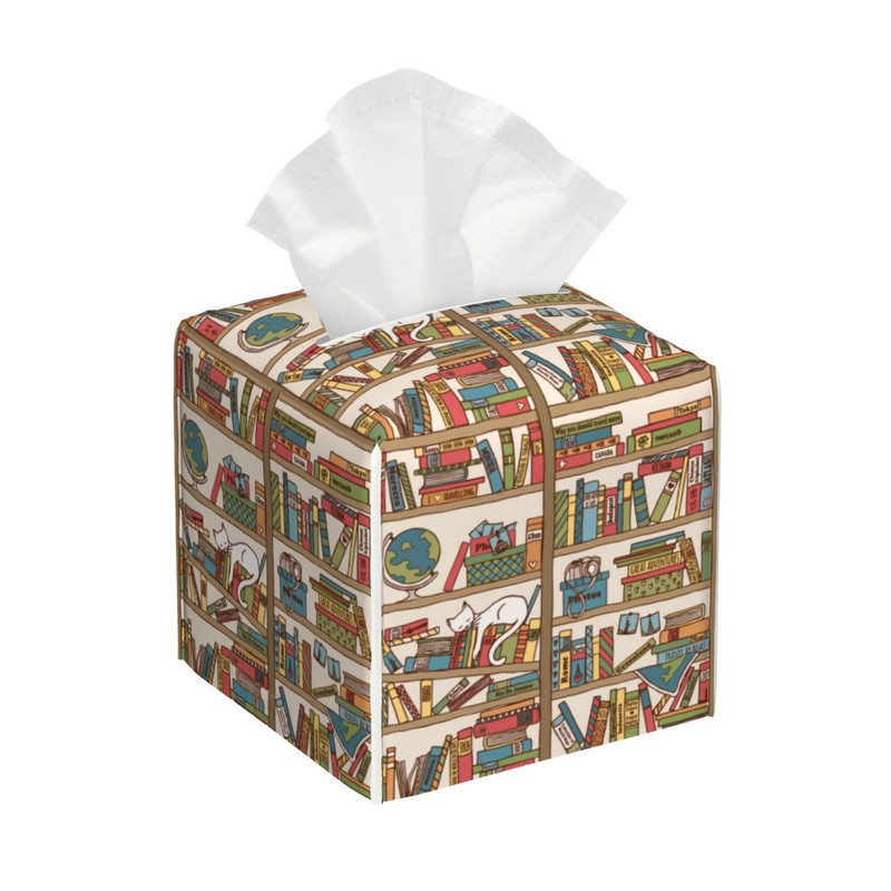 OHEGBXE Tissue Box Cover Cat on Bookshelf Leather Tissue Box Holder Cube Paper Case Cover Facial Paper Organizer Dispenser for Bathroom, Vanity Countertop, Office Desk