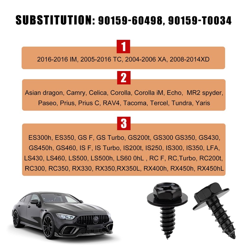 - 【Exact Fit】: Designed to replace part numbers 90159-60498 and 90159-T0034, these bolts are specifically compatible with models like Avalon, Camry, Corolla, ES300h and RAV4, among others. For optimal compatibility, please verify the part numbers and specifications of your vehicle before purchase.