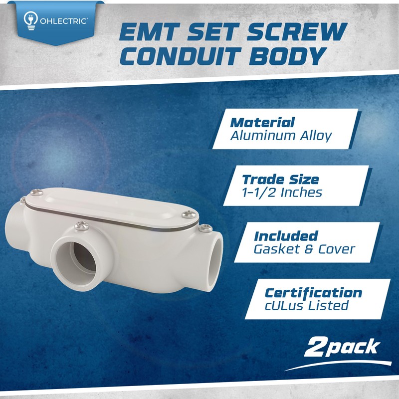 OHLECTRIC Heavy Duty Aluminum EMT Set Screw Conduit Body (T-Type - 1 ½”) Service Entrance Elbow Conduit Bodies, Durable Conduit Fitting, Rustproof, Cover & Gasket Included Conduit Body Fitting (2-Pk)