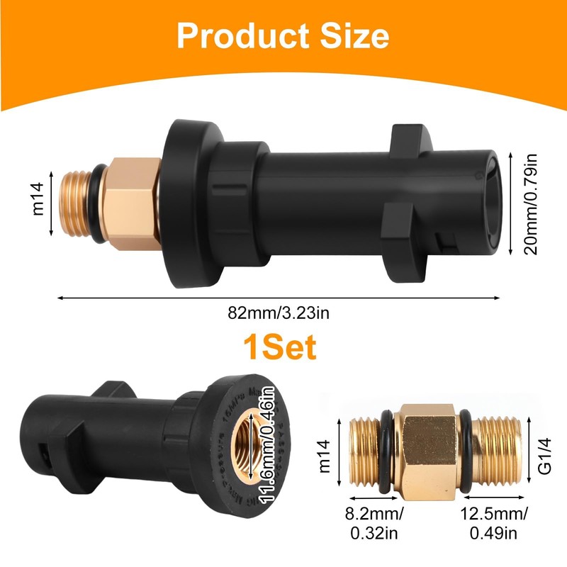 - Pressure Washer Adapter: One male thread adapter and a 1/4 F foam cannon female connector (compatible with Karcher K Series K2, K3, K4, K5, K6, and K7) were included in the package