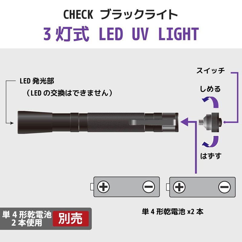 - Specifications: Power Supply: 2 x AAA batteries (sold separately); Light Source: 3 x UV LEDs (cannot be replaced); Wavelength: 375 nm ± 5 nm Maximum Current Consumption: Approx. 120 mA; Continuous Usage Time: Approx. 20 hours (when using new alkaline batteries); Product Weight: Approx. 1.6 oz (45 g) (batteries separately); External Dimensions: Approx. diameter 0.7 x length 6.7 inches (19 mm) Excluded)