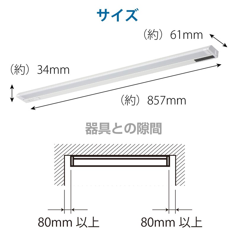 - Specifications: Rated voltage: AC 100 V 50/60 Hz; Rated power consumption: 14.0 W (less than 0.5 W when standby); Light source: Daylight color; Total luminous flux: 1300 lm; Inherent energy consumption efficiency: 92.8 lm/W. Average color rendering index: Ra80. Where to use: Indoor (outdoor Do not use it.) External dimensions: (approx.) W 33.7 x H 1.3 x D 2.4 inches (857 x 34 x 61 mm). Product weight: Approx. 17.6 oz (506 g). Mounting pitch: 29.5 inches (755 mm). Accessories: 2 fixing screws, 1 x power cord, 1 x Lithium coin battery (CR2025/built-in remote control