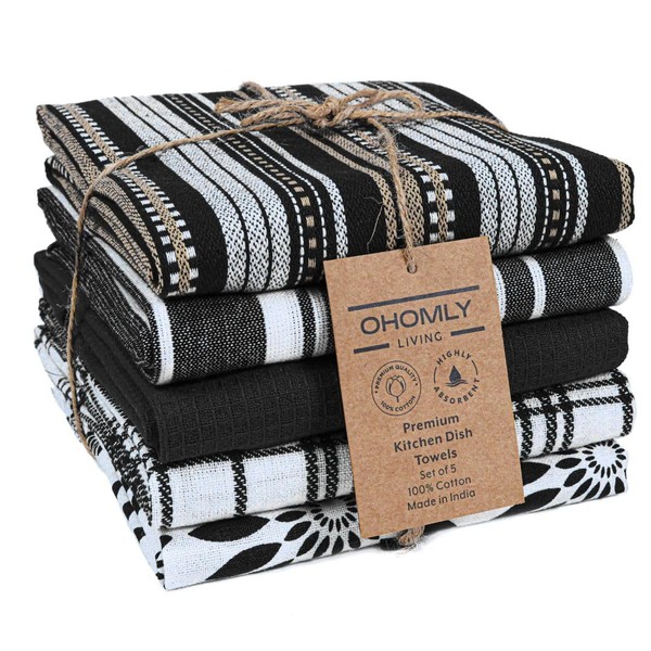 OHOMLY LIVING Assorted Kitchen Towels Set of 5-100% Cotton Dish Cloths Towels with Hanging Loop - Soft, Absorbent & Washable for Kitchen Use - Quick Drying Dish Towels 16x26 Inch Black