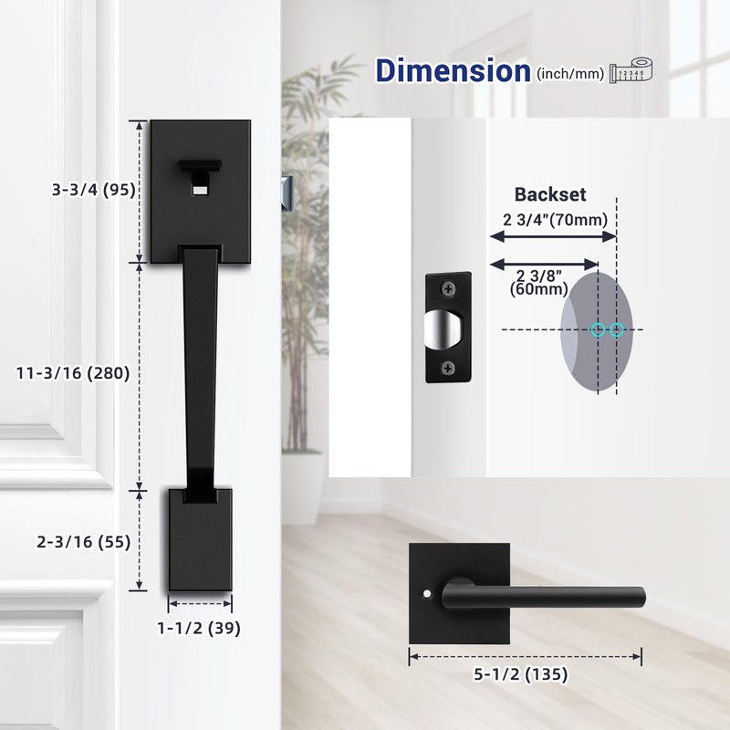 - FITS STANDARD DOOR SIZES: The zinc alloy diecast exterior door handle is professionally designed for residential interior doors in 35-45mm (1-3/8'' to 1-3/4'') thickness. With a 60mm(2-3/8") or 70mm(2-3/4'') adjustable latch bolt(The backset of the latches). The hole drill of the handle set can be adjusted from 194mm/7.64'' to 230mm/9.05''.The Door Hole Distance Drill need ≤2 1/8''(54mm). NOTE: Before you purchase the black door handle, measure the thickness and backsets.