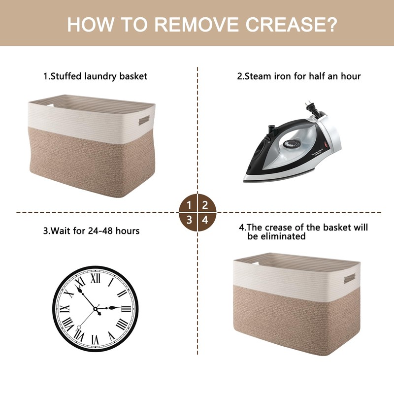 - Washable Big Basket: This shoes basket can be washed by hand or machine with gentle detergent. If machine washed, please put them into a laundry bag. NOTE: These cotton rope baskets are folded when shipping, but it will turn back to its elegant shape quickly if you fill it with some towels or clothing, and iron is great idea to remove the creases