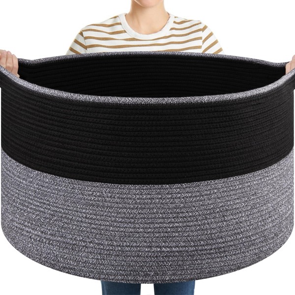 OIASKET Large Blanket Basket with Handles, 22.8" x 22.8" x 13" Woven Storage Basket for Living Room, Cotton Rope Baby Toy Storage for Clothes, Pillows, Towels-Black and Grey