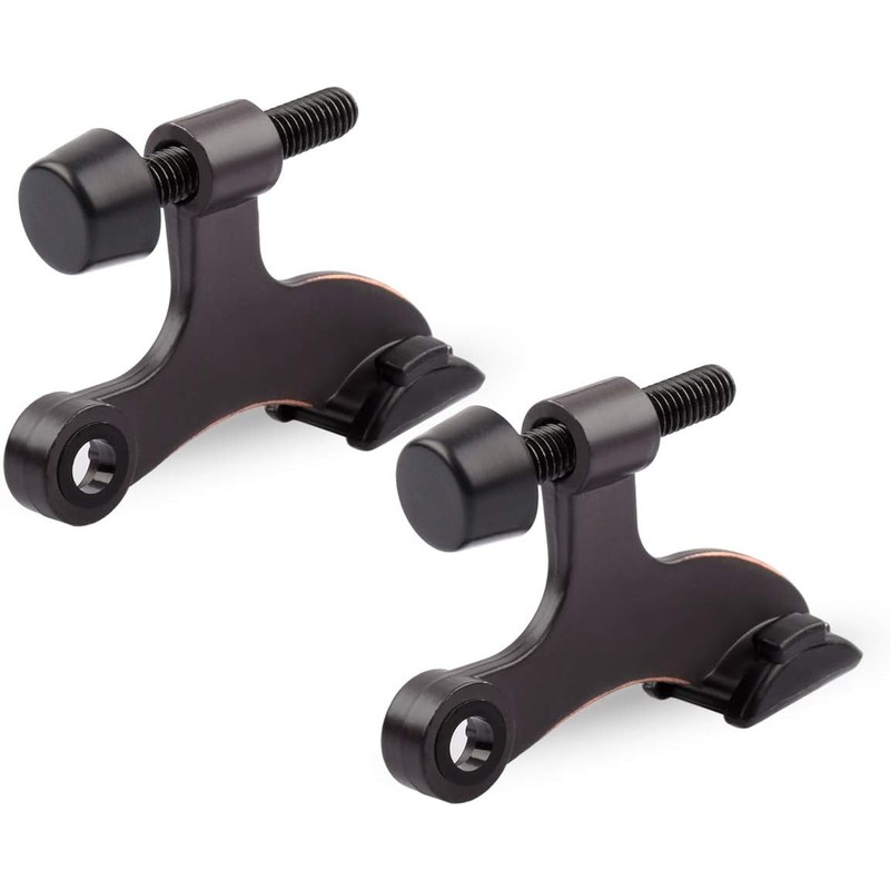 Oil rubbed bronze hinge pin door stopper with rubber bumpers designed to control door swing and help protect walls and doors without drilling. Includes 2 pieces.