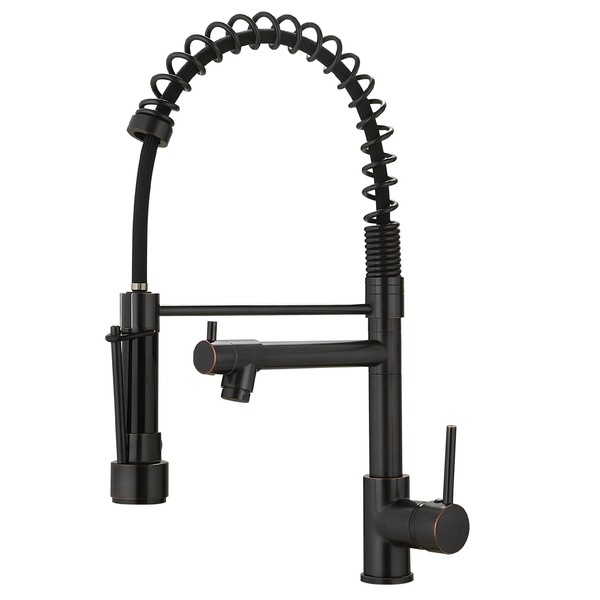 - Heavy Duty Sturdy Commercial Style oil rubbed bronze kitchen faucet Spring Design, Suitable for Big Sink or Granite Counter Tops.With a one-function bronze kitchen faucet with sprayer and a separate pot filler spout, this pull out faucet allows you to handle all types of tasks. This kitchen sink faucet with 360 Degree Swivle Sprayer and Spout can turn on at the same time which and the pre rinse faucet ensures high pressure while still saving on water.